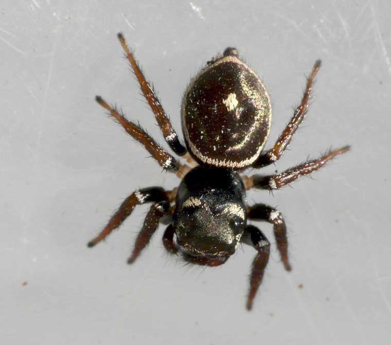 A medium-sized jumping spider in coastal areas from southern NSW to Exmouth WA, probably in all Australian coastal areas including Tasmania. The body is brown to black, the female having a circular abdomen fringed with white, a white dot in the centre. Legs brownish to nearly black. Cephalothorax with white scales marking out the eye quadrangle, the male's markings more obvious. The male's more slender abdomen has a white crescent above the spinnerets. They hunt during the day by ambush or active pursuit, often on tree trunks, preferring ants but also eating other insects. First described Hasarius orbiculatus by Keyserling in 1881, placed in Pystira by Simon in 1901, transferred to Zenodorus by Zabka and Davies in 1989. Zenodorus was also the name of a Greek mathematician 200-140 BC ♀ 9mm ♂ 7mm